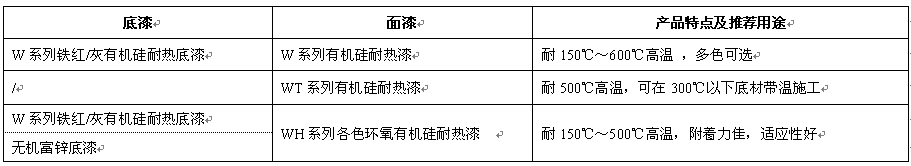 耐候性好、耐高溫,用于發(fā)動(dòng)機(jī)外殼、排氣管、鍋爐、煙囪、烘箱、高溫設(shè)備等需耐熱部分的保護(hù)裝飾。耐高溫面漆分為W有機(jī)硅系列、WH環(huán)氧有機(jī)硅系列和WT可帶溫涂裝系列三種,耐高溫底漆分為無機(jī)富鋅系列和W有機(jī)硅系列兩種,鮮艷色系的環(huán)氧有機(jī)硅系列漆在高溫時(shí)容易變色,不建議使用。