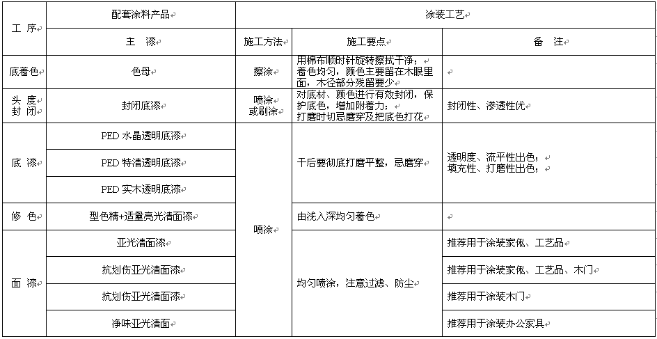 涂裝風(fēng)格:全封閉式涂裝 適用底材:實(shí)木板、貼木皮板、貼紙板 涂裝部件:家俬、工藝品、木門、辦公家具 涂裝環(huán)境:溫度:25℃、濕度:65%±5